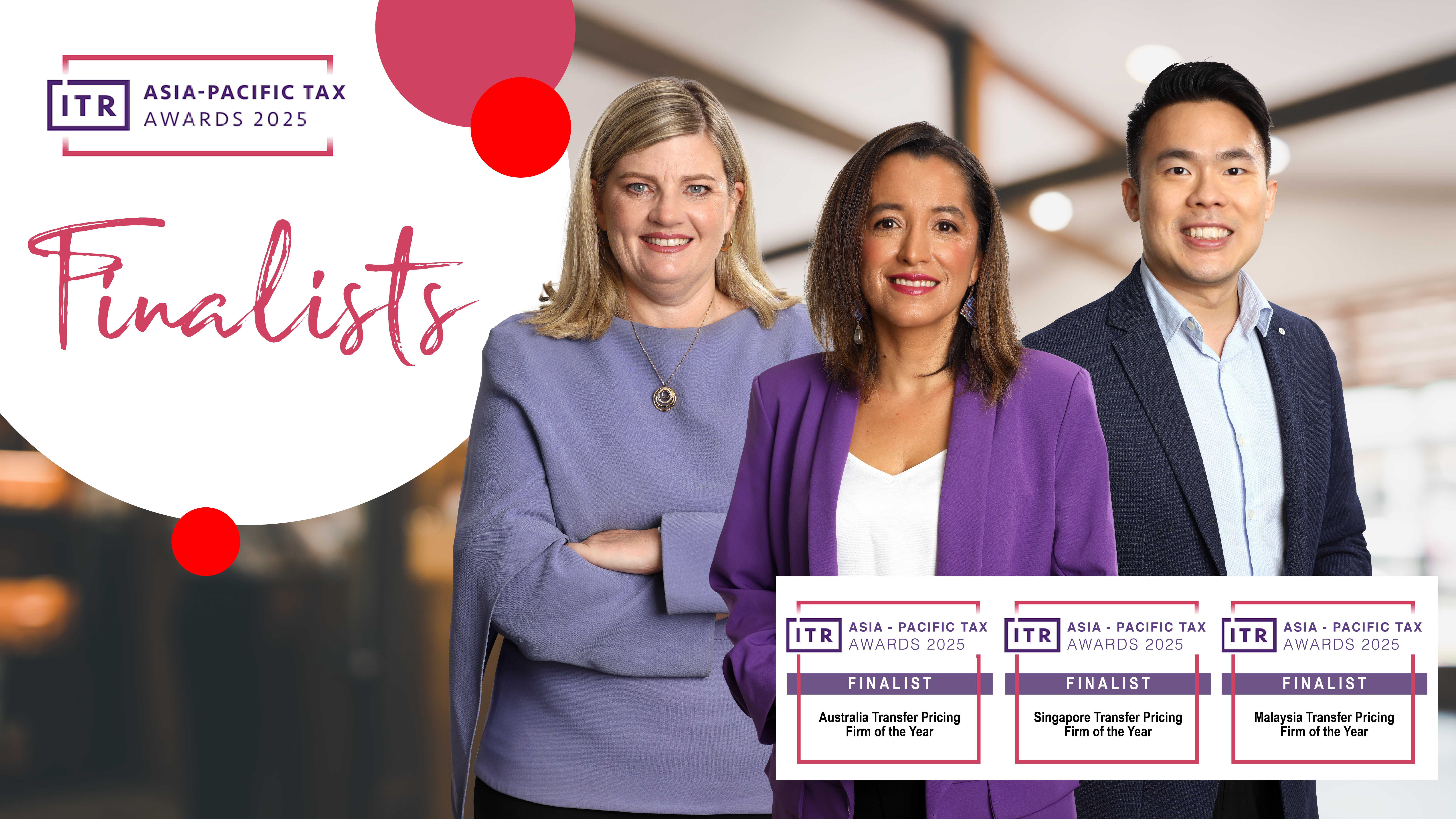 Transfer Pricing Solutions has been named a finalist in the prestigious 2025 ITR Asia-Pacific Tax Awards in three key jurisdictions: Australia, Singapore, and Malaysia, under the category of Transfer Pricing Firm of the Year.